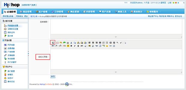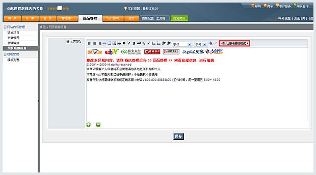 • 獲取在線客服安裝代碼,然后登陸Hishop后臺,進(jìn)入店鋪管理》網(wǎng)店基本設(shè)置,找到“自定義頁尾”,點擊“HTML代碼”按鈕,把在線客服代碼復(fù)制粘貼到編輯框,點擊保存。